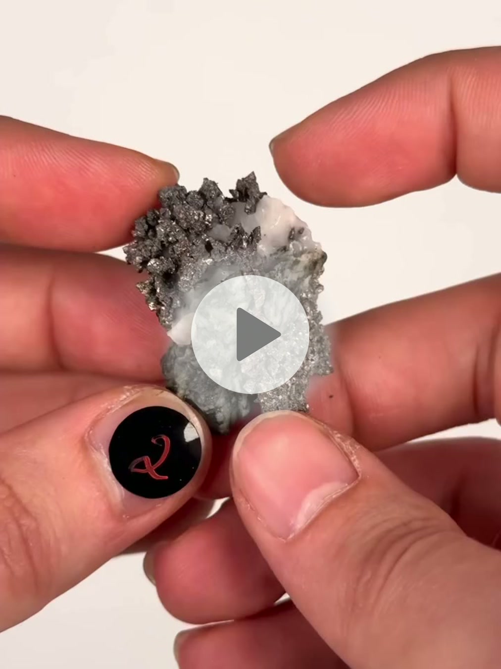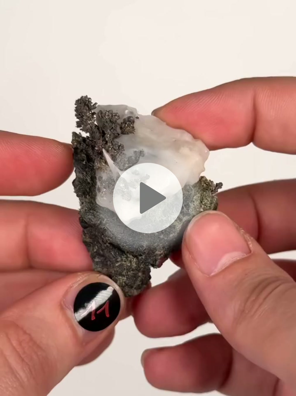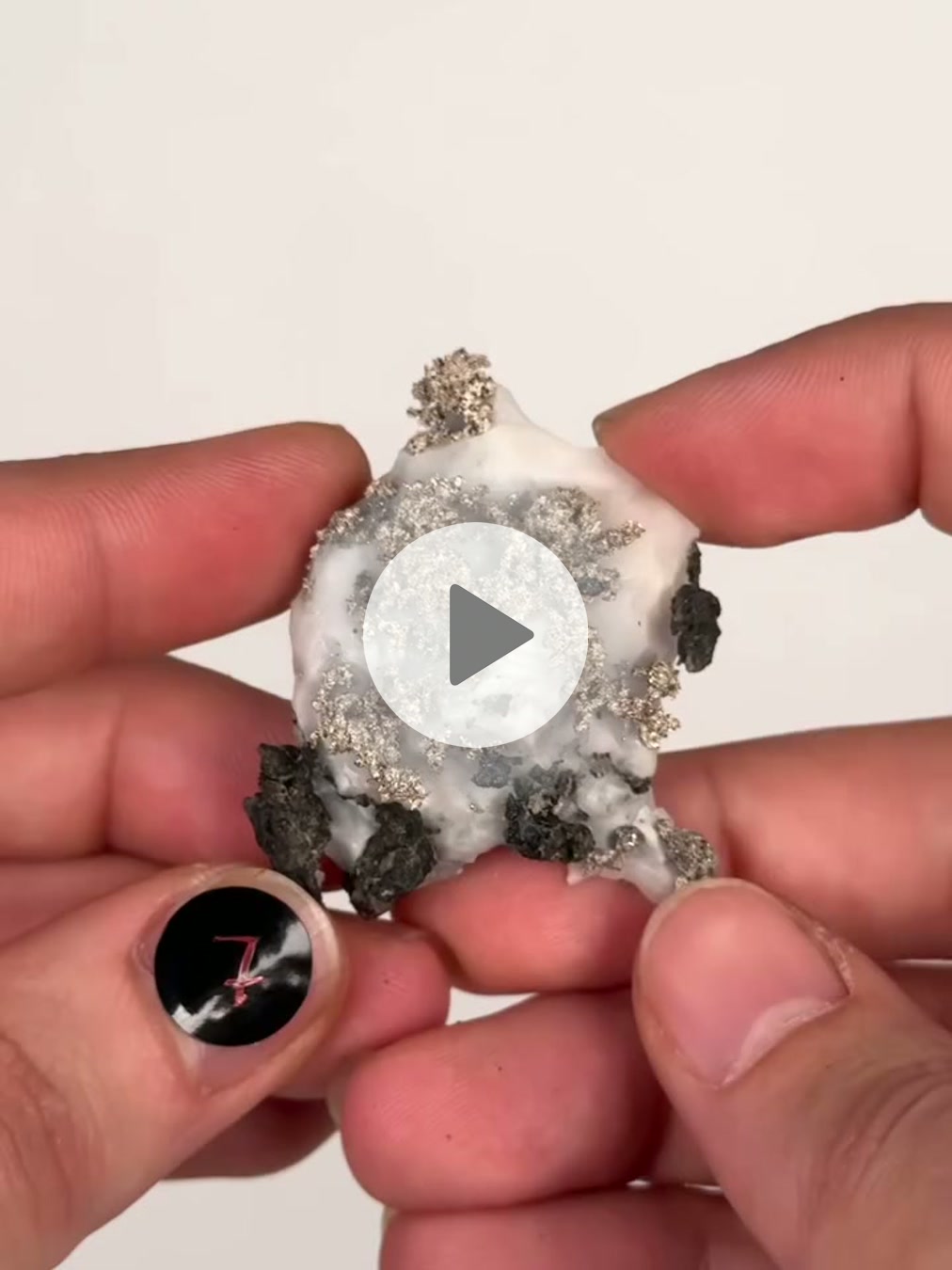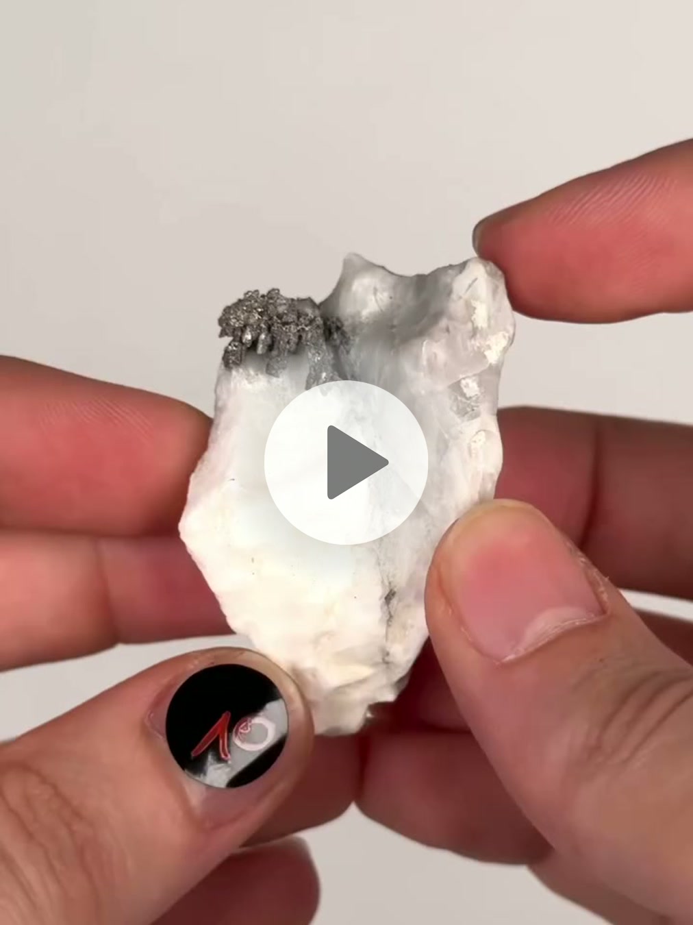 Der Calcit reagiert unter UV-Licht mit einem zarten Rosa, was dieser Kombination eine zweite Ebene gibt. Im Tageslicht zeigt sie den kühlen Kontrast von Weiß und Metall, im UV-Licht antwortet dieselbe Matrix mit einer stillen, warmen Farbe.
