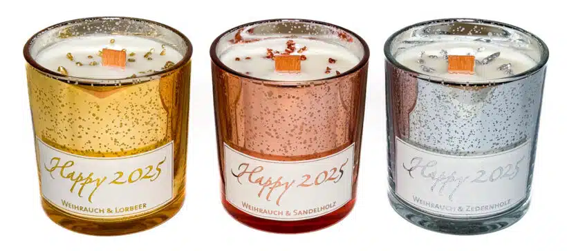 Die Jahreskerzen „Happy 2025“ bestehen aus europäischem Rapswachs und rein pflanzlichen Ölen (220g) mit einem Holzdocht. Die Brenndauer beträgt etwa 40 Stunden. Das metallisch beschichtete Kerzenglas ist ca. 8 cm hoch und hat einen Durchmesser von ca. 8 cm.