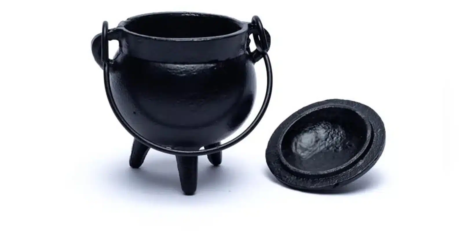 Dreibeinige, gusseiserne Räucherschale mit Henkel und Deckel.