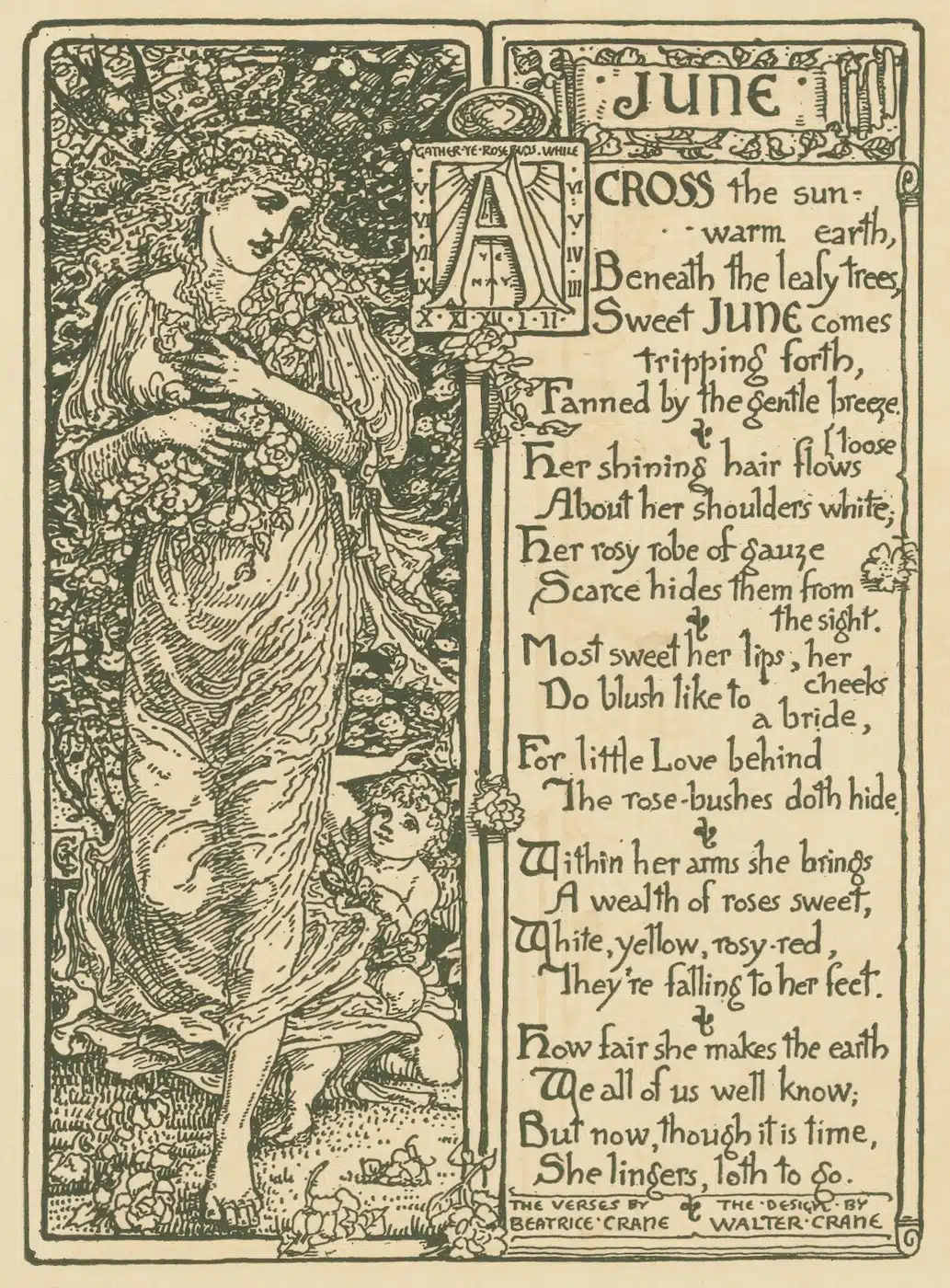 Im späten viktorianischen England, als die Industrialisierung das Land im Griff hatte, entstand etwas ganz Besonderes: Walter Crane verbildlichte die charakteristischen Eigenschaften der Monate als weibliche Allegorien und kombinierte sie mit lyrischen Versen seiner Tochter Beatrice.