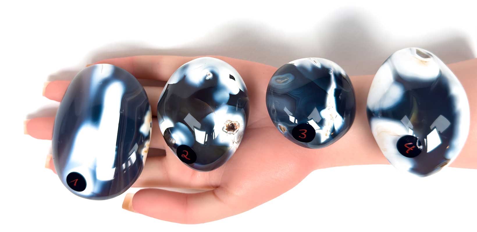 Der Orca-Achat ist ein bläulich-schwarz-weißer Chalcedon (Chalcedone mit einer Bänderung nennt man Achat), der mit diesem Muster nur auf Madagaskar vorkommt. Er vereint den schützenden Onyx (schwarzer Chalcedon) mit dem ausgleichenden weißen Friedens-Achat, dem leistungs- steigernden grauen Achat und dem kommunikationsfördernden blauen Chalcedon.