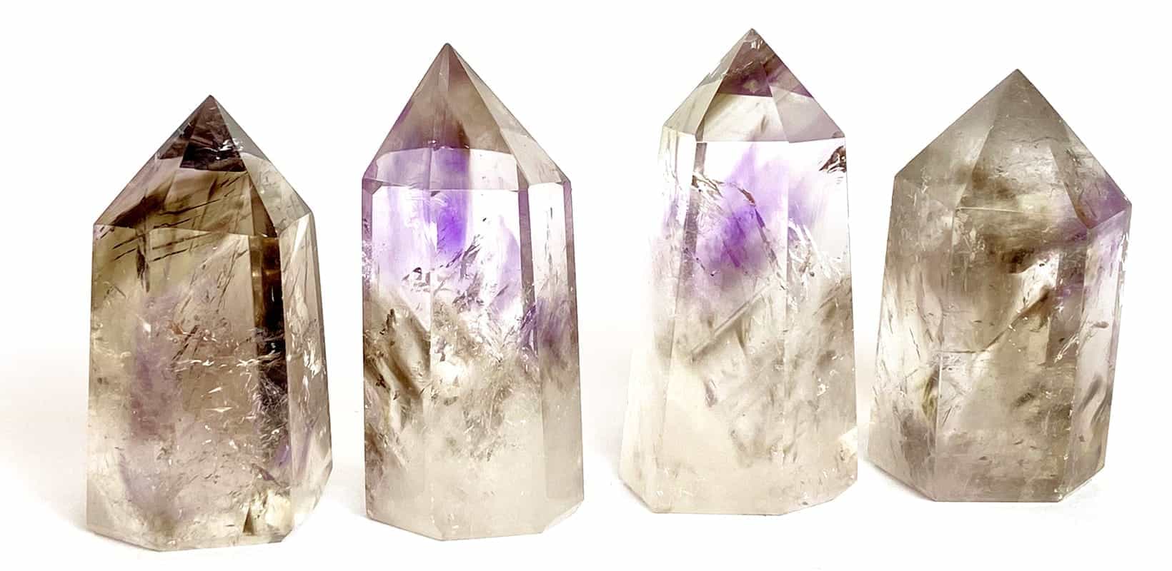 Schon beim gelben Citrin und dem violetten Amethyst ist es aber nicht mehr auf den ersten Blick klar, dass der Ursprung kein anderer ist, als der des Bergkristalls.